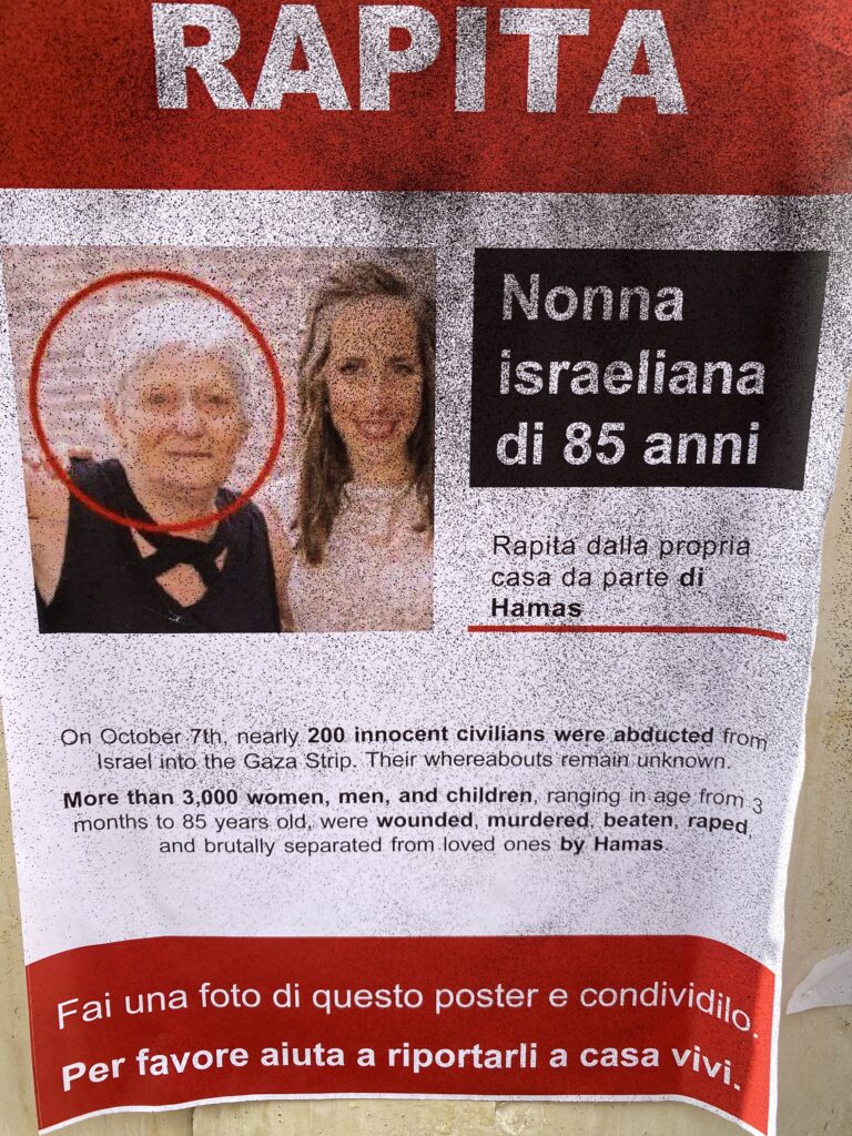 Universinet.it – Dopo aver colpito nei giorni scorsi le “pietre di inciampo” i vandali hanno imbrattato con vernice a spruzzo nera anche i volantini che commemorano gli ebrei rapiti da Hamas affissi per ricordarne il rapimento. Questo gesto non solo costituisce un attacco alla comunità ebraica, ma intralcia anche il dialogo e le motivazioni del movimento pro-palestinese, il quale chiedendo l’immediato cessate il fuoco si si basa sulla costruzione di pace e comprensione tra le parti.