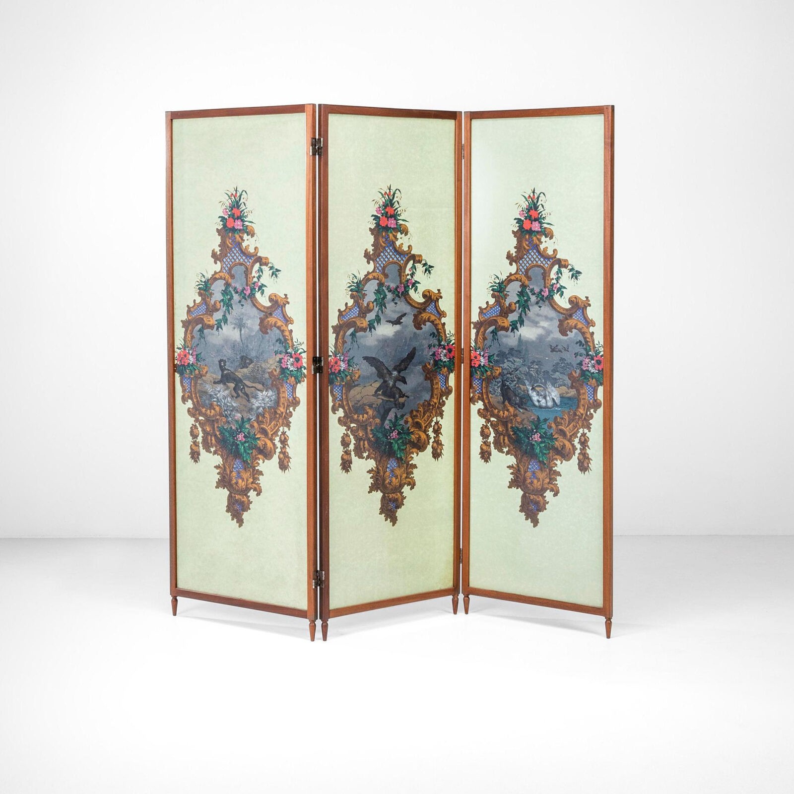Tra i lotti di maggior rilievo un paravento di Carlo Mollino (Torino, 1905 – 1973), coltissimo architetto, designer e fotografo italiano. Questo oggetto, in cui una struttura in legno incornicia tre pannelli in laminato con decori serigrafati con scene di caccia di gusto barocco,; sarà lo sfondo di moltissime delle sue famose Fotografie segrete, scatti personali che hanno accompagnato tutta la sua attività artistica.