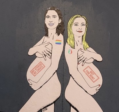 UniversiNet.it – Nude, appoggiate di schiena l’una all’altra, con due tatuaggi sulle braccia, raffiguranti il tricolore italiano e la bandiera dell’arcobaleno. L’opera è stata prodotta in un periodo storico in cui Meloni e Schlein si trovano in una situazione di competizione per il potere nel panorama politico italiano. Questo avviene in concomitanza con un dibattito parlamentare riguardo alla maternità surrogata, e una proposta di legge che punta a renderla un crimine perseguibile anche fuori dai confini nazionali.