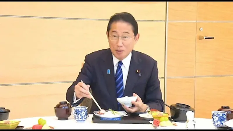 “Molto Buono e gustoso [美味しい Oshii in giapponese]” il commento per tranquillizzare gli spettatori e sopratutto i consumatori di pesce e molluschi giapponesi in Cina e Corea del Sud.