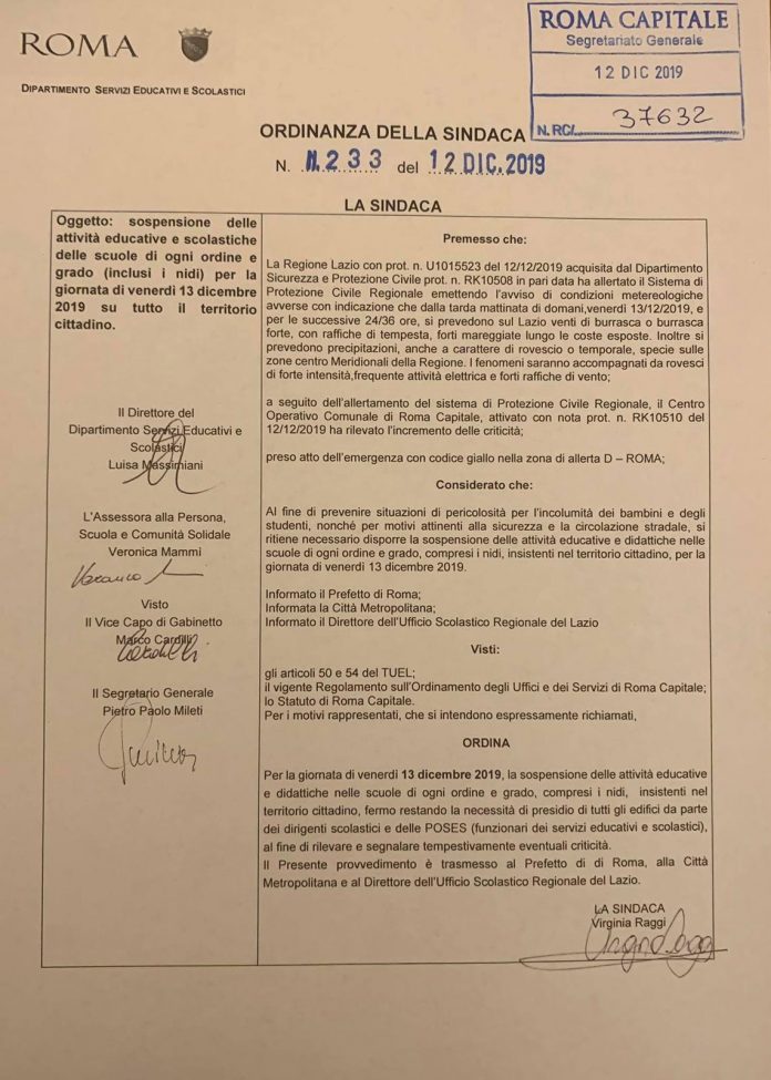 Scuola NotizieUniversità & Ricerca Ordinanza Raggi chiusura scuole domani 13/12/2019 12 Dicembre 2019 By Redazione Universinet Magazine Share FacebookTwitterWhatsAppLinkedinTelegramLINE Ecco di seguito l’ordinanza con cui il Sindaco di Roma Virginia Raggi ha decretato la chiusura delle scuole di ogni ordine e grado. Redazione Universinet MagazineRedazione Universinet Read more Education Il Fiasco del Semestre Filtro a Medicina: Università Bocciate all’Esame, Docenti da Cacciare – E i Corsi Privati da 1000€/Mese. VerdeFuturo Torino ospita le ATP Finals, ma il suo nome non lo sa nessuno: è marketing globale che dimentica il territorio? Cronache Un visionario dimenticato: Angelo Dalle Molle, l’uomo che inventava il futuro ROME MUST-SEE ATTRACTIONS Vatican Museum and Sistine Chapel: How to Avoid Tourist Traps and Tickets the Smart Way PrimaPagina Nasce la prima “Offline Room” universitaria in Italia: via lo smartphone, torna la mente libera. Il progetto UER che riduce stress e abbandoni Local News Education Il Fiasco del Semestre Filtro a Medicina: Università Bocciate all’Esame, Docenti da Cacciare – E i Corsi Privati da 1000€/Mese. VerdeFuturo Torino ospita le ATP Finals, ma il suo nome non lo sa nessuno: è marketing globale che dimentica il territorio? Cronache Un visionario dimenticato: Angelo Dalle Molle, l’uomo che inventava il futuro ROME MUST-SEE ATTRACTIONS Vatican Museum and Sistine Chapel: How to Avoid Tourist Traps and Tickets the Smart Way